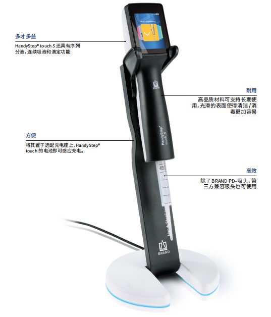- HandyStep® touch 具有連續(xù)分液功能、自動分液功能和移液功能,HandyStep® touch S 額外具有序列分液功能、連續(xù)吸液功能和滴定功能