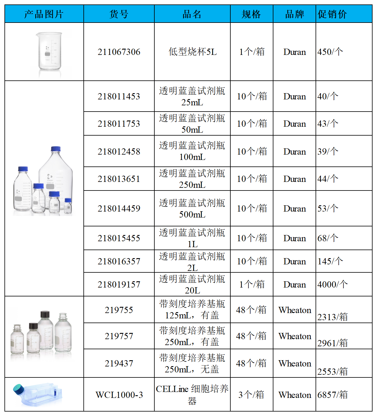 為了回饋新老客戶的支持,上海恒奇儀器為廣大用戶提供DWK明星產(chǎn)品現(xiàn)貨大促銷福利,包括DURAN藍(lán)蓋瓶,燒杯,WHEATON培養(yǎng)基瓶,CELLine 細(xì)胞培養(yǎng)器。詳情如下: