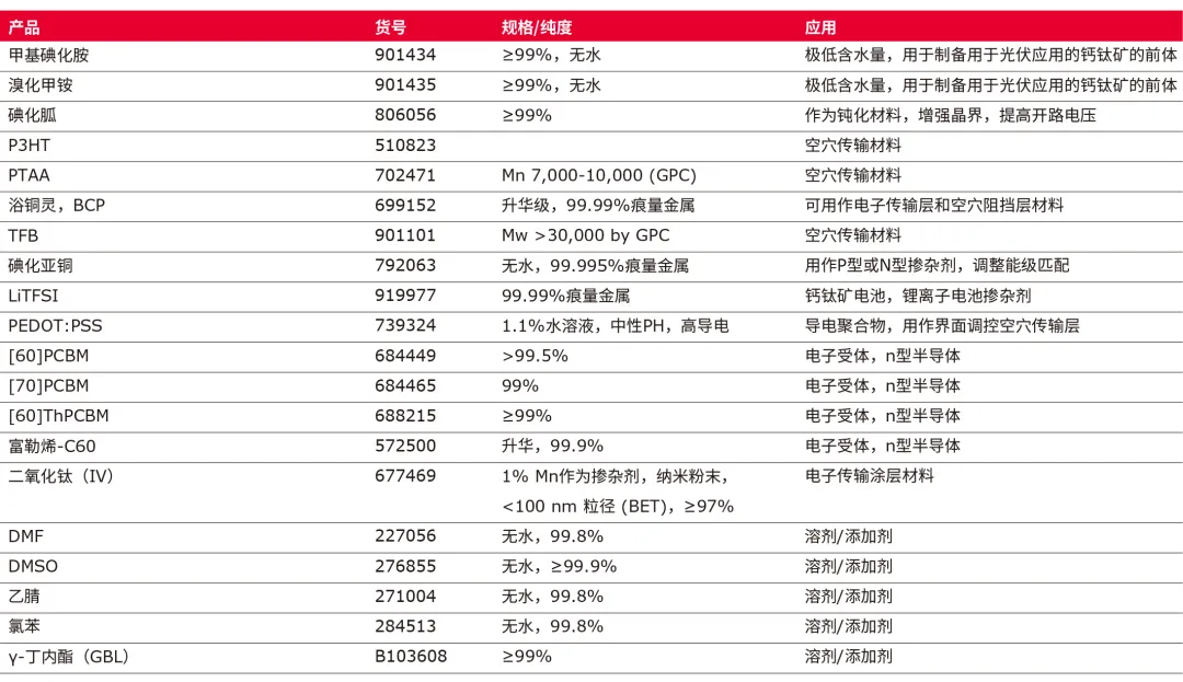 聯(lián)系我們,為您提供Sigma-Aldrich®材料在鈣鈦礦電池應(yīng)用的詳細(xì)數(shù)據(jù)和優(yōu)惠報(bào)價(jià)。
