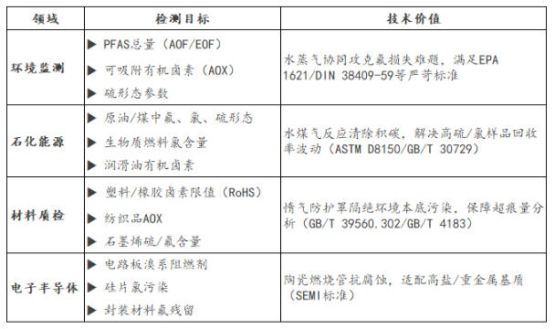 這場(chǎng)戰(zhàn)役的破局點(diǎn),在于對(duì)“氟”的終極掌控——而氟,僅是鹵素家族的一員。當(dāng)全球監(jiān)管風(fēng)暴席卷PFAS,、的精準(zhǔn)測(cè)定需求同步激增。從電子電器RoHS管控到生物質(zhì)燃料氯限值,從原油硫形態(tài)到紡織品AOX,多基質(zhì)樣品中鹵素與硫的分析,已成為環(huán)境、化工、電子等多領(lǐng)域的共性技術(shù)剛需。