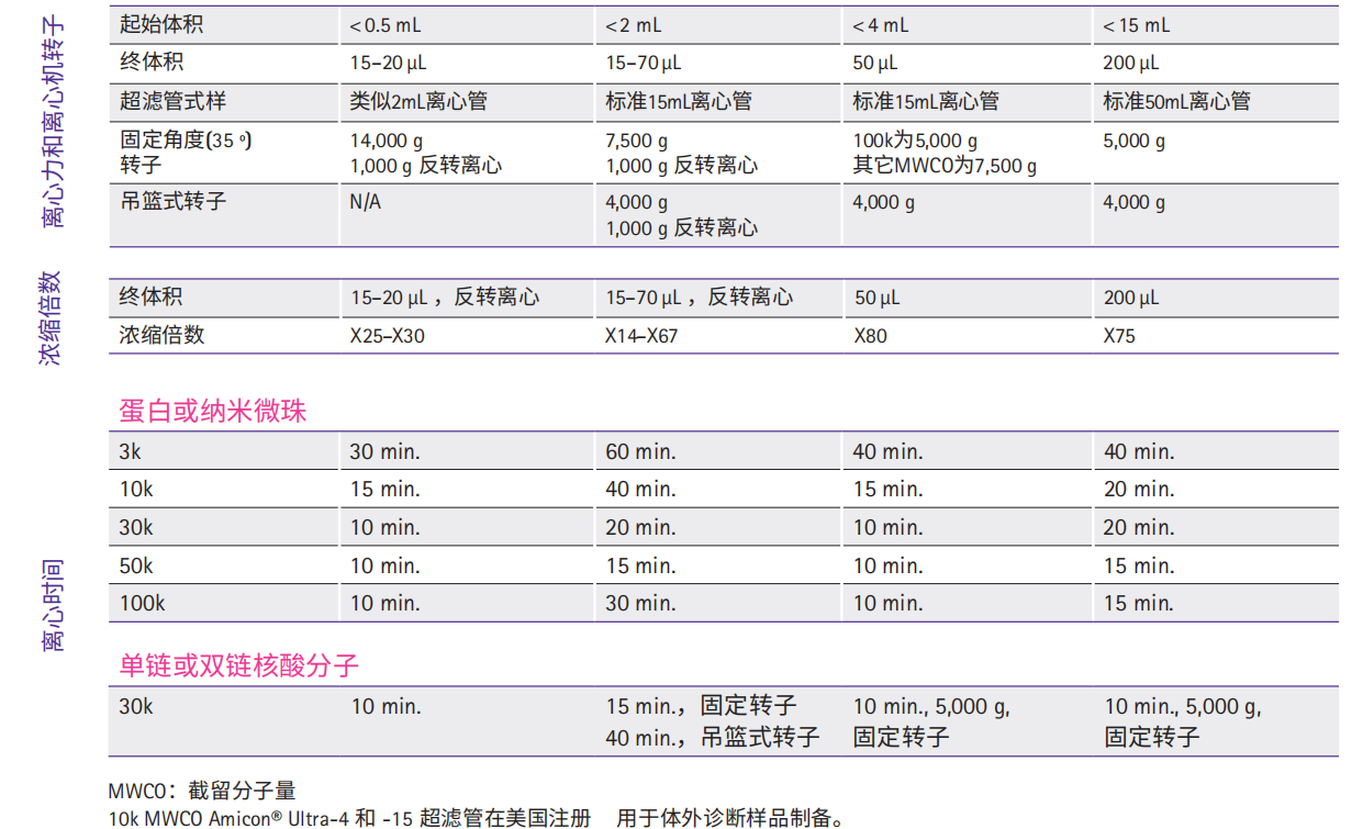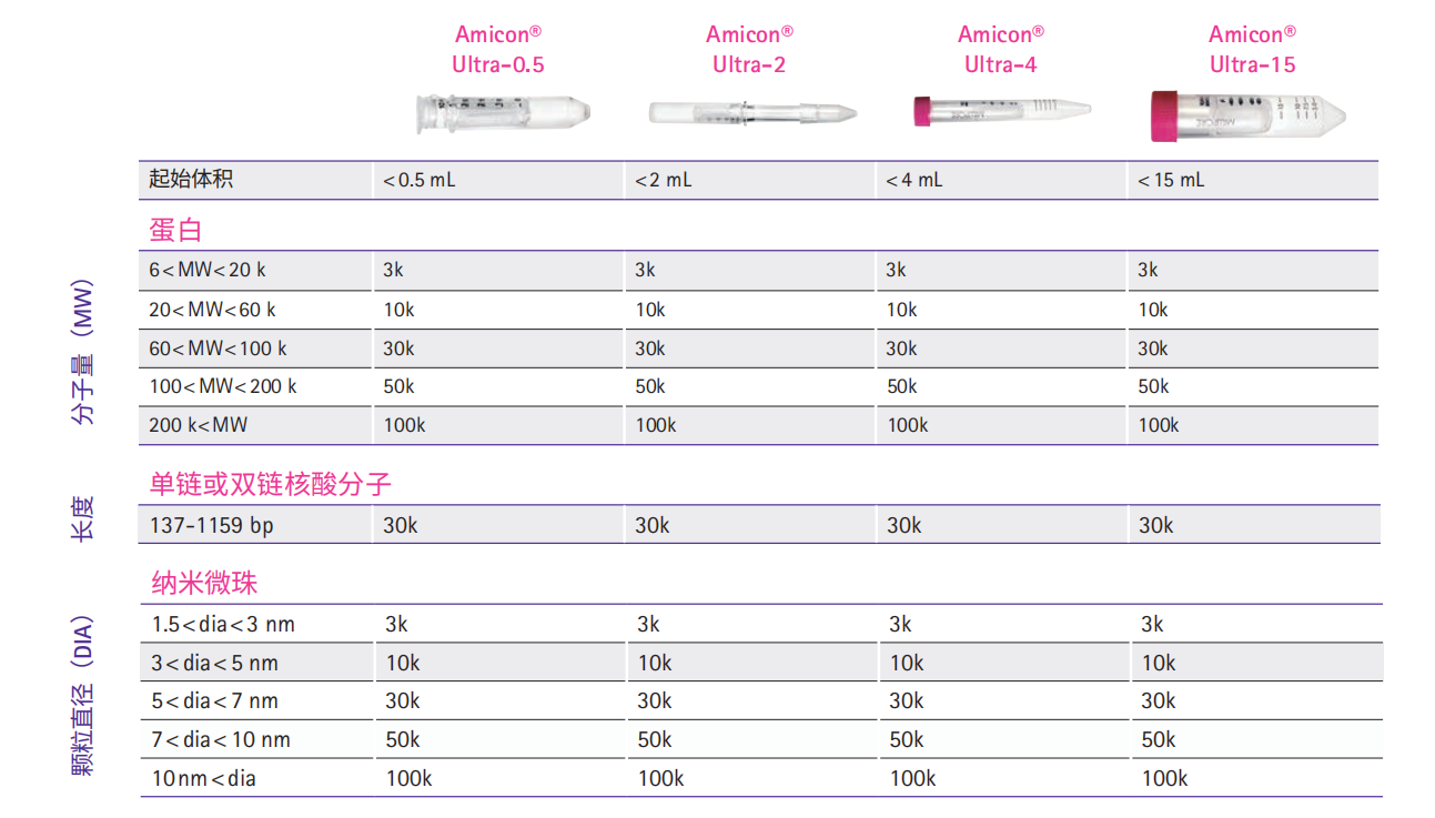 Amicon® Ultra系列超濾管產(chǎn)品需要根據(jù)起始樣品體積、目標蛋白或核酸的分子量、終體積及濃縮倍數(shù)等選擇具體型號。下表為選擇最適合截留分子量的超濾管提供了一些參考建議。