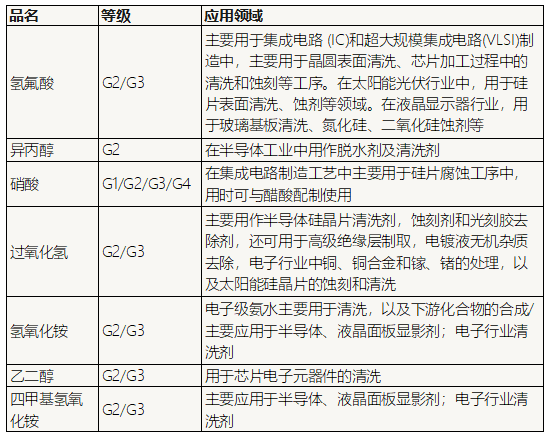 超凈高純(VLSD) 試劑是大規(guī)模集成電路(IC) 及高檔半導(dǎo)體器件制造過(guò)程的專用化學(xué)品,主要用于硅單晶片的清洗、光刻、腐蝕工序中,下游應(yīng)用領(lǐng)域?yàn)榘雽?dǎo)體,光伏太陽(yáng)能電池,LED和平板顯示。它的純度和潔凈度對(duì)集成電路的成品率、電性能、可靠性都有著重要的影響。