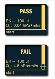 PLT會(huì)依據(jù)國(guó)際標(biāo)準(zhǔn)ISO 8655-2對(duì)檢測(cè)情況進(jìn)行判定,在屏幕中顯示結(jié)果,右側(cè)的條形圖表示QL的臨界值與泄露情況。